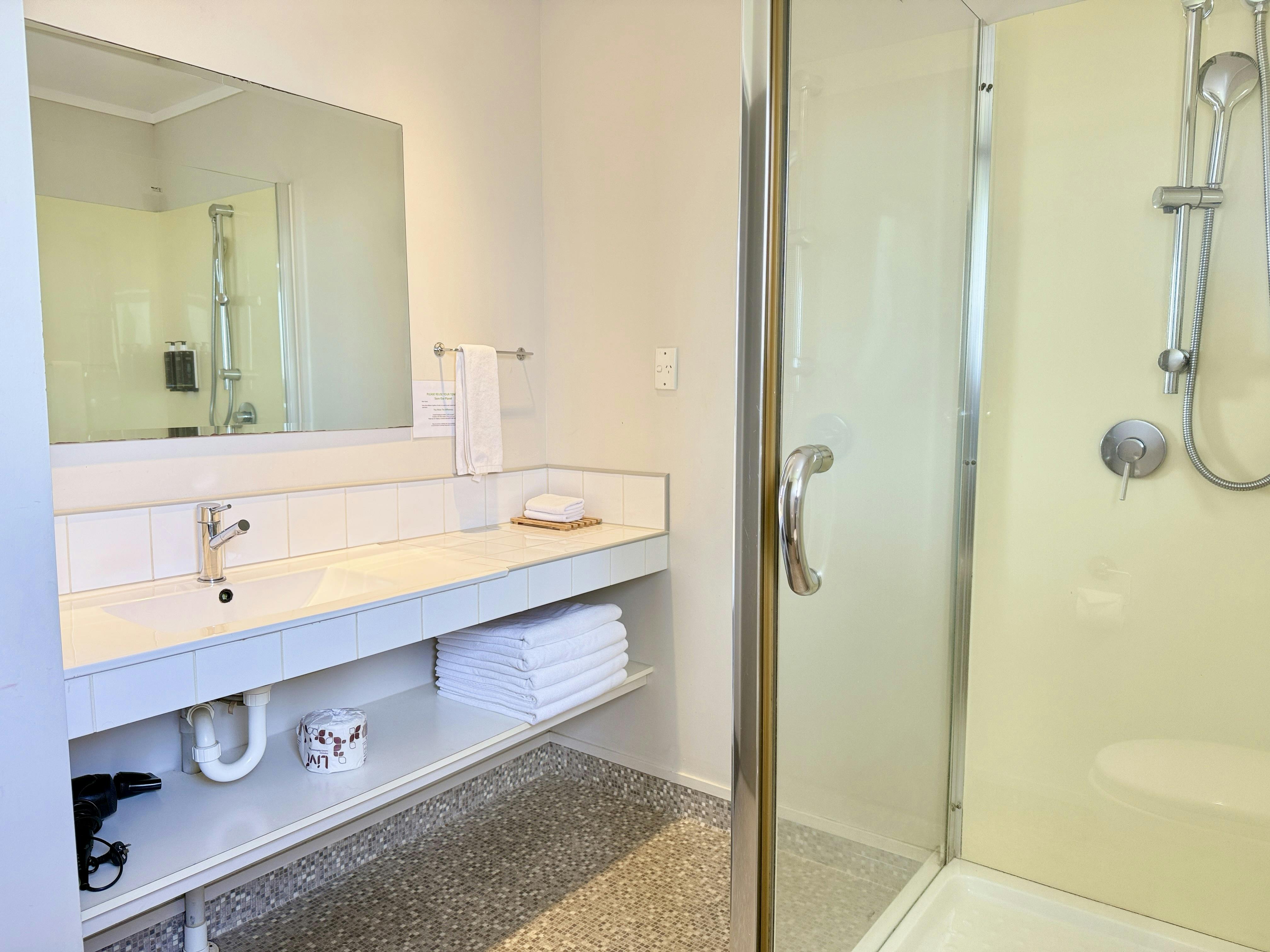 Private bathroom with shower, toilet, fresh towels, complimentary toiletries, and a hairdryer